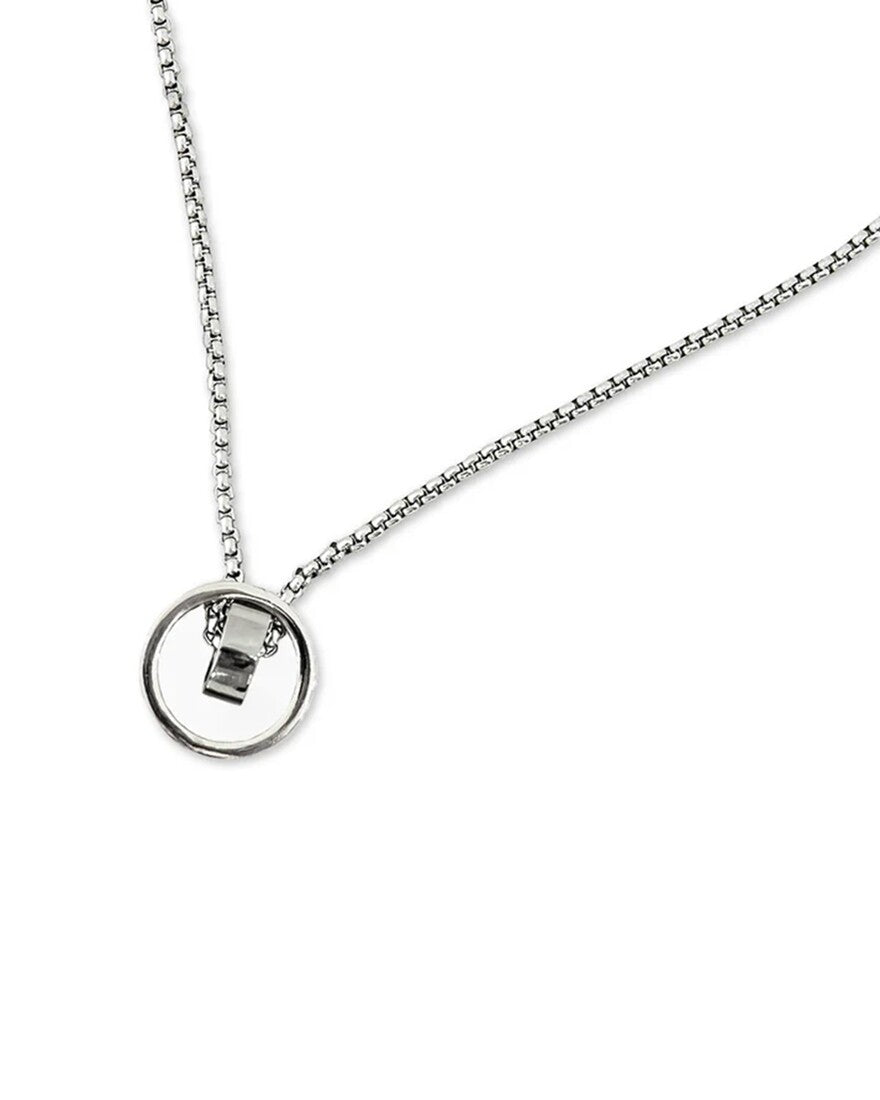 Το ασημί ατσάλινο στρογγυλό κρεμαστό σε γυαλιστερό ασημί τόνο και ισομετρικές λεπτομέρειες κρέμεται σε μια ασορτί ασημί ατσάλινη αλυσίδα λαιμού. Ανθεκτική, διακριτική, cool.